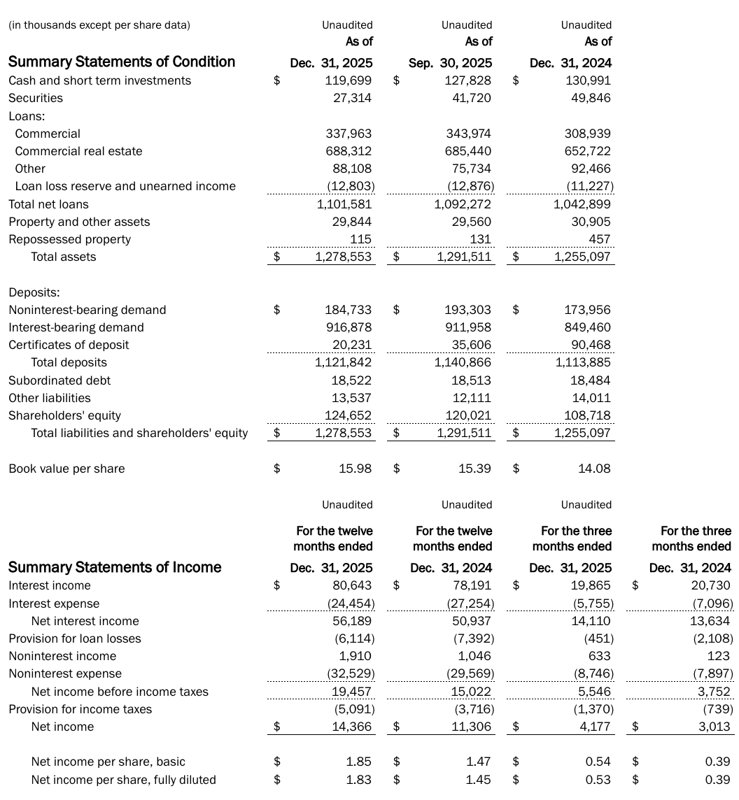 - Q4 2025 Net Income – $4.18 million or $0.53 per fully diluted share, an increase of 38.6 percent over Q4 2024.